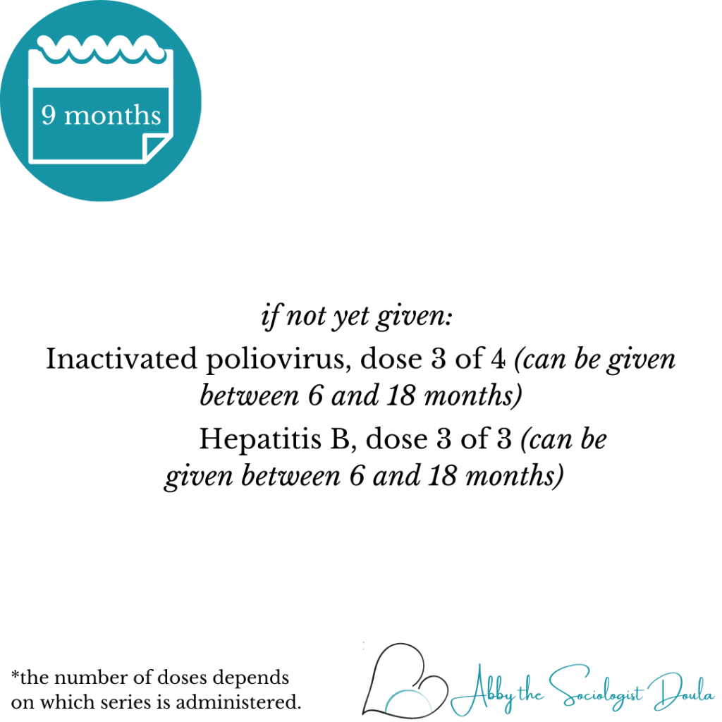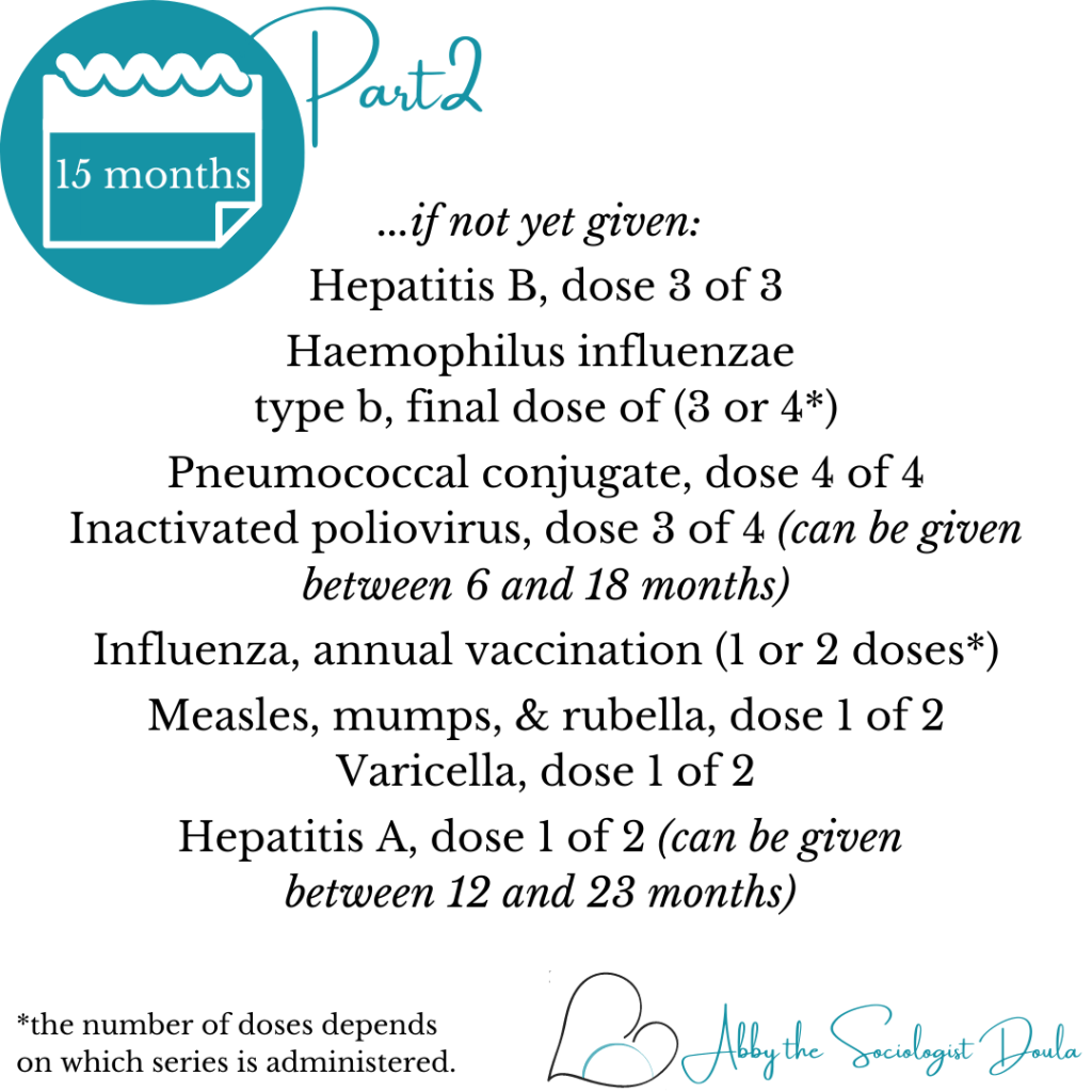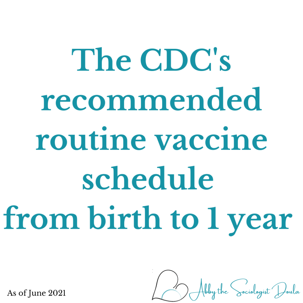 Keep in mind that these use the recommended schedule as of June 2021 for a baby with no medical conditions. Some children benefit from additional vaccines or vaccines administered sooner or later than these recommendations. These pictures are just meant to be an initial starting point for your consideration (and a handy resource if you’re running into a checkup with no idea what’s on the agenda for discussion that day). Talk to your doctor if you have questions about what vaccines or vaccine timelines you should consider for your child.