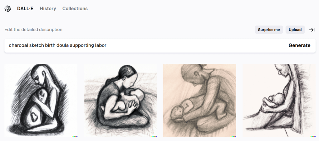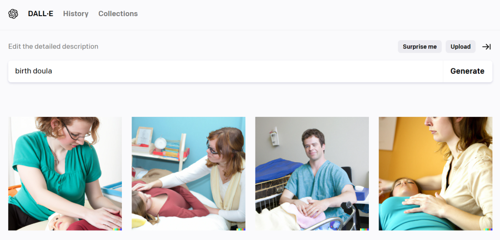 To me, these don’t at all portray the experience of having a doula. My clients describe me, and I describe the doula I had at my daughter’s birth, as warm, caring, supportive, engaging…not exactly the words that came to mind when I saw the first images AI created for me.